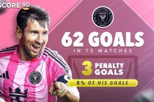 梅西:邁阿密國際75場62球,3點球,占比5%