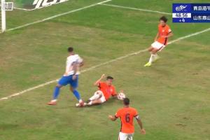 VAR沈寅豪介入,主裁判王迪看過(guò)回放后認(rèn)定劉軍帥手球犯規(guī),判給泰山點(diǎn)球。