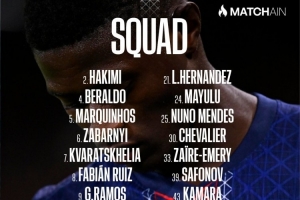 巴黎對馬賽名單:K77領銜,登貝萊、杜埃、內(nèi)維斯、巴爾科拉缺席