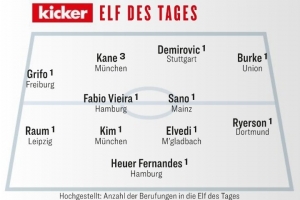 體育資訊9月22日訊 《踢球者》公布了本輪德甲最佳陣,凱恩和金玟哉領(lǐng)銜。