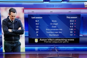 這是維拉本賽季5輪英超打進(jìn)的唯一進(jìn)球,BBC也盤點(diǎn)了維拉本賽季英超相較上賽季的場均進(jìn)攻數(shù)據(jù),可謂全面下滑,具體如下: