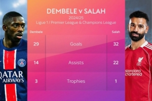 日前,英媒《天空體育》對(duì)比了登貝萊、薩拉赫2024/25賽季在聯(lián)賽和歐冠的數(shù)據(jù)。