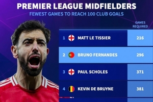 據(jù)德國(guó)轉(zhuǎn)會(huì)市場(chǎng)統(tǒng)計(jì),B費(fèi)已為曼聯(lián)打進(jìn)100球,英超時(shí)代只有8名中場(chǎng)球員為俱樂部(所有賽事)打進(jìn)100球,而B費(fèi)是所用場(chǎng)次第2少的中場(chǎng)球員。