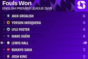 體育資訊9月24日訊 英超第5輪戰(zhàn)罷,squawkafootball列各項(xiàng)數(shù)據(jù)排行,格拉利什是本輪造對手犯規(guī)次數(shù)最多的球員,共有6次。