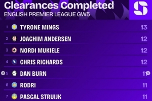 體育資訊9月24日訊 英超第5輪戰(zhàn)罷,squawkafootball列各項(xiàng)數(shù)據(jù)排行,維拉后衛(wèi)明斯是本輪解圍最多的球員,共13次。