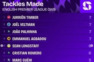 體育資訊9月24日訊 英超第5輪戰(zhàn)罷,squawkafootball列各項(xiàng)數(shù)據(jù)排行,廷伯、帕利尼亞等四名球員是本輪完成搶斷次數(shù)最多的球員,各有7次。