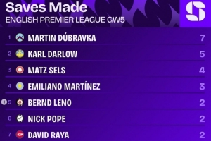 體育資訊9月24日訊 英超第5輪戰(zhàn)罷,squawkafootball列各項數(shù)據(jù)排行,伯恩利門將杜布拉夫卡是本輪撲救次數(shù)最多的門將,共有7次。