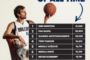 NBA歐洲官方賬號曬出歐洲球員得分前十,具體如下: