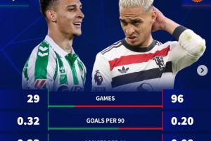 體育資訊9月25日訊 在歐聯(lián)杯貝蒂斯2-2戰(zhàn)平諾丁漢森林的比賽中,安東尼傳射建功。德轉(zhuǎn)也對比了安東尼在效力曼聯(lián)以及貝蒂斯期間各項賽事數(shù)據(jù)情況,具體如下: