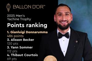 體育資訊09月27日訊 2025年雅辛獎(jiǎng)排名詳情公布,榮獲該獎(jiǎng)項(xiàng)的意大利門將多納魯馬以486分?jǐn)鄬宇I(lǐng)先,第2名阿利森獲得120分,第3名索默獲得112分。