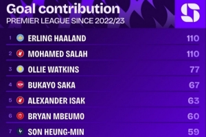 據(jù)Squawka的數(shù)據(jù)統(tǒng)計(jì),自哈蘭德加盟曼城以來(lái),他已經(jīng)在英超聯(lián)賽直接參與110粒進(jìn)球,同期沒(méi)有哪名球員比他更多,只有薩拉赫同樣參與110粒進(jìn)球與他持平。