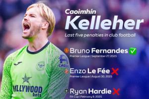 【撲點高手】Opta:凱萊赫效力于利物浦和布倫特福德期間,共面對7次點球(不包括點球大戰(zhàn)),其中撲出4次(57 %)。
