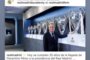 弗洛倫蒂諾迎來(lái)?yè)?dān)任皇馬主席25周年紀(jì)念日,俱樂(lè)部社媒發(fā)文致敬,本澤馬轉(zhuǎn)發(fā)了皇馬俱樂(lè)部的社媒動(dòng)態(tài)。