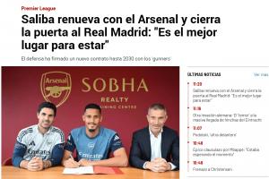 《阿斯報》的題目則是《官方:皇馬錯過薩利巴,阿森納官宣與法國中衛(wèi)續(xù)約至2030年,這名球員原本在皇馬的引援計劃中》