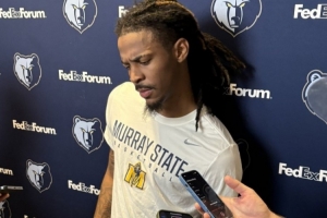 體育資訊10月2日訊 莫蘭特在訓(xùn)練營特地穿上了母校莫瑞州立大學(xué)的T恤。在采訪的時候,莫蘭特表示自己每天都會穿莫瑞州立大學(xué)的裝備。