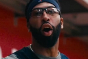 視頻當(dāng)中,濃眉戴著護(hù)目鏡底角三分一發(fā)入魂,場邊的歐文搞怪互動(dòng)。