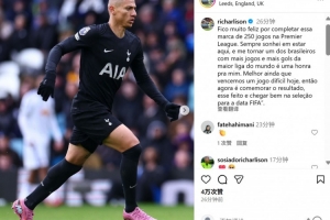 體育資訊10月4日訊 在本輪英超,熱刺2-1擊敗利茲聯(lián),理查利森替補(bǔ)登場(chǎng)完成英超第250次出場(chǎng)。