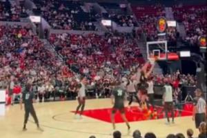 GIF-楊瀚森擋拆順下,面對克林根強勢高打板打三分
