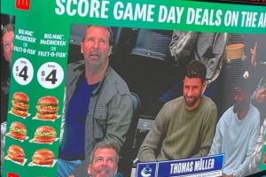 穆勒受邀觀看溫哥華加人隊(duì)的冰球比賽,并被現(xiàn)場(chǎng)大屏幕介紹。