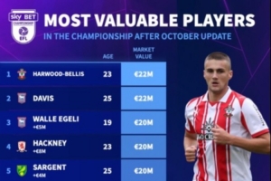 體育資訊10月6日訊 德轉(zhuǎn)更新英冠球員身價(jià),在目前的英冠球員身價(jià)中,南安普頓球員貝利斯和伊鎮(zhèn)球員戴維斯2200萬(wàn)歐并列第一。