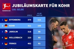 體育資訊10月7日訊 德國轉(zhuǎn)會市場統(tǒng)計了球員在德甲聯(lián)賽中吃到黃牌的數(shù)量,并列出榜單,埃芬博格111黃居首,科赫100黃次席。