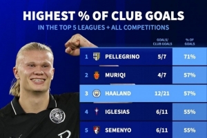 體育資訊10月7日訊 德國轉(zhuǎn)會市場統(tǒng)計了本賽季五大聯(lián)賽球員進(jìn)球占比,哈蘭德攻入曼城57%的進(jìn)球,占比并列第二高,姆巴佩54%、凱恩47%。