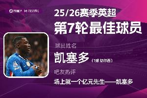 2025-2026賽季英超火熱進(jìn)行中,體育資訊和咪咕體育聯(lián)合發(fā)起每輪英超最佳球員評(píng)選活動(dòng)!第7輪評(píng)選結(jié)果出爐,切爾西后腰凱塞多攻防兼?zhèn)?,轟入世界波幫助切爾西2-1戰(zhàn)勝利物浦,獲得吧友5.6萬票的支持,當(dāng)選 【體育資訊X咪咕體育英超第7輪最佳球員】!