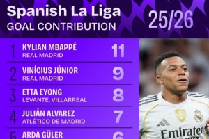 體育資訊10月7日訊 日前,Squawka統(tǒng)計了本賽季西甲參與進球次數(shù)排行,姆巴佩參與11球居首。