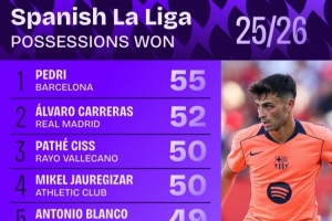 體育資訊10月7日訊 日前,Squawka統(tǒng)計了本賽季西甲奪回球權(quán)次數(shù)排行,佩德里55次居首,卡雷拉斯52次第二。