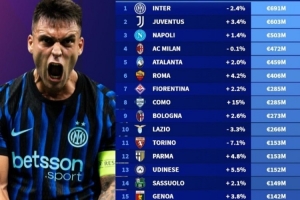 體育資訊10月8日訊 德轉(zhuǎn)更新了意甲俱樂部陣容身價排行,國際米蘭球員身價下降了2.4%,但仍以6.91億歐元領跑榜單,尤文圖斯、那不勒斯和AC米蘭分列二三四位,值得注意的是,科莫陣容身價漲幅達到15%,以2.85億歐元排名第八位。