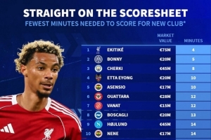 體育資訊10月8日訊 德國轉(zhuǎn)會(huì)市場(chǎng)統(tǒng)計(jì)了今夏新援攻入處子球的時(shí)間,并排出最快處子球榜單,?;倏?分鐘攻入首球居首。