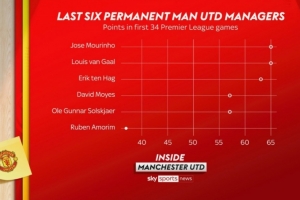 執(zhí)教曼聯(lián)的前34場英超比賽,索爾斯克亞和莫耶斯均拿到了57分,滕哈赫拿到了63分,而范加爾和穆里尼奧均拿到了65分。