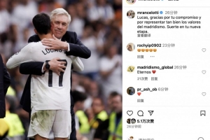 安切洛蒂社媒寫道:“盧卡斯,感謝你的付出,以及你對皇馬精神的出色詮釋。祝你在新的階段一切順利。”