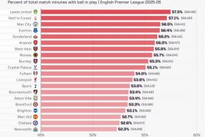 體育資訊10月10日訊 OPTA統(tǒng)計(jì)了本賽季至今英超20隊(duì)凈比賽時(shí)間占據(jù)總比賽時(shí)間的比率,利茲聯(lián)居首,紐卡、切爾西、曼聯(lián)倒數(shù)前三。