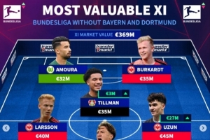 體育資訊10月15日訊 德轉(zhuǎn)更新了德甲球員身價(jià),同時(shí)列出德甲除拜仁多特外身價(jià)最高的球員陣容,法蘭克福5人、勒沃庫(kù)森2人,斯蒂勒盧克巴在列。