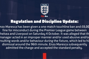 切爾西主教練馬雷斯卡因在10月4日周六對(duì)陣?yán)锲值挠⒊?lián)賽中存在不當(dāng)行為,被處以一場(chǎng)場(chǎng)邊禁賽及8000英鎊罰款。該指控指出馬雷斯卡在比賽第96分鐘被罰離場(chǎng)前,存在不當(dāng)行為或使用侮辱性、攻擊性言語。馬雷斯卡本人已承認(rèn)指控并接受標(biāo)準(zhǔn)處罰。