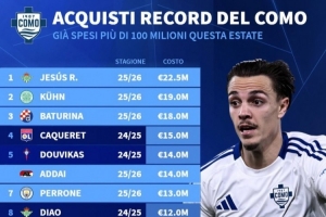 體育資訊7月18日訊 德國轉(zhuǎn)會市場盤點(diǎn)了科莫隊(duì)史引援排行,今年夏天已花費(fèi)超過1億歐。