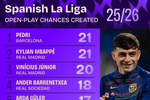 體育資訊10月16日訊 日前,Squawka統(tǒng)計(jì)了本賽季西甲運(yùn)動(dòng)戰(zhàn)創(chuàng)造機(jī)會(huì)排行,