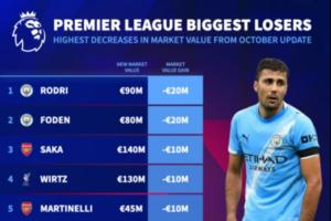 體育資訊10月17日訊 德轉(zhuǎn)更新英超身價(jià),其中跌的最多的是羅德里和福登,他們身價(jià)都下降了2000萬(wàn)歐。