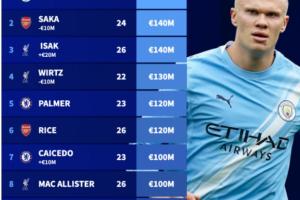 體育資訊10月17日訊 今日德轉(zhuǎn)更新英超身價(jià),其中伊薩克漲至1.4億歐,薩卡跌至1.4億,維爾茨跌至1.3億。