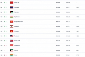 體育資訊10月17日訊 IFA更新最新一期國(guó)家隊(duì)排名,亞足聯(lián)國(guó)家隊(duì)方面,國(guó)足積分不變,但排名從世界第94位升至世界第93位,亞洲排名則仍是第14位。