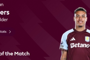 本場比賽上半場維拉球員羅杰斯打進(jìn)遠(yuǎn)射世界波,賽后他也當(dāng)選英超官方球迷票選全場最佳球員。