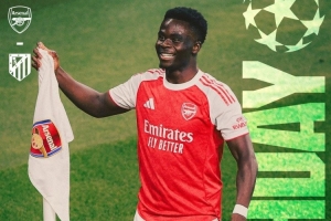 賽前,阿森納官方曬出海報,為本場比賽預(yù)熱。薩卡單人出鏡,海報左上角為對陣雙方隊徽,右上角為歐冠標志。