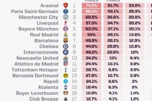 體育資訊10月21日訊 歐冠聯(lián)賽階段第三輪開賽在即,opta超級計算機更新了歐冠奪冠概率,其中阿森納位列榜首,巴黎、曼城分列二三。