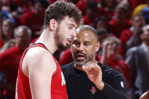 體育資訊10月22日訊 NBA常規(guī)賽揭幕戰(zhàn),火箭對陣雷霆的比賽已經(jīng)進行到末節(jié)。