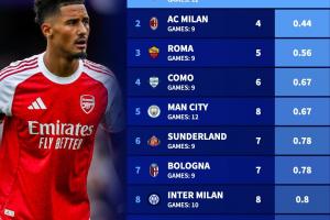 體育資訊10月22日訊 凌晨歐冠比賽阿森納4-0完勝馬競,賽后德轉(zhuǎn)官方統(tǒng)計本賽季五大聯(lián)賽球隊丟球最少榜,阿森納12場僅丟3球排名榜單第一。以下是根據(jù)場均丟球數(shù)的排名↓