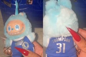 她曬出了一個特別的拉布布,這個拉布布穿著克萊的獨(dú)行俠31號球衣,脖子上還帶著獨(dú)行俠Logo的大鏈子。