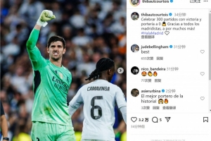 此役是庫爾圖瓦為皇馬出戰(zhàn)的第300場比賽,他在社交媒體上寫道:“以勝利和零封慶祝300場里程碑!感謝所有皇馬球迷,未來還有更多場比賽!”
