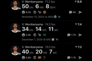 全場比賽,文班僅出場29分40秒,21投15中,三分2中1,罰球11中9,爆砍40分15籃板1助攻1搶斷3蓋帽,正負(fù)值+31。