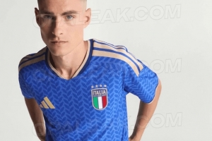 阿迪達(dá)斯標(biāo)志性的加大版三條紋位于肩部,而阿迪達(dá)斯和意大利足協(xié)的徽章則采用金色,醒目地突出在藍(lán)色底色上。